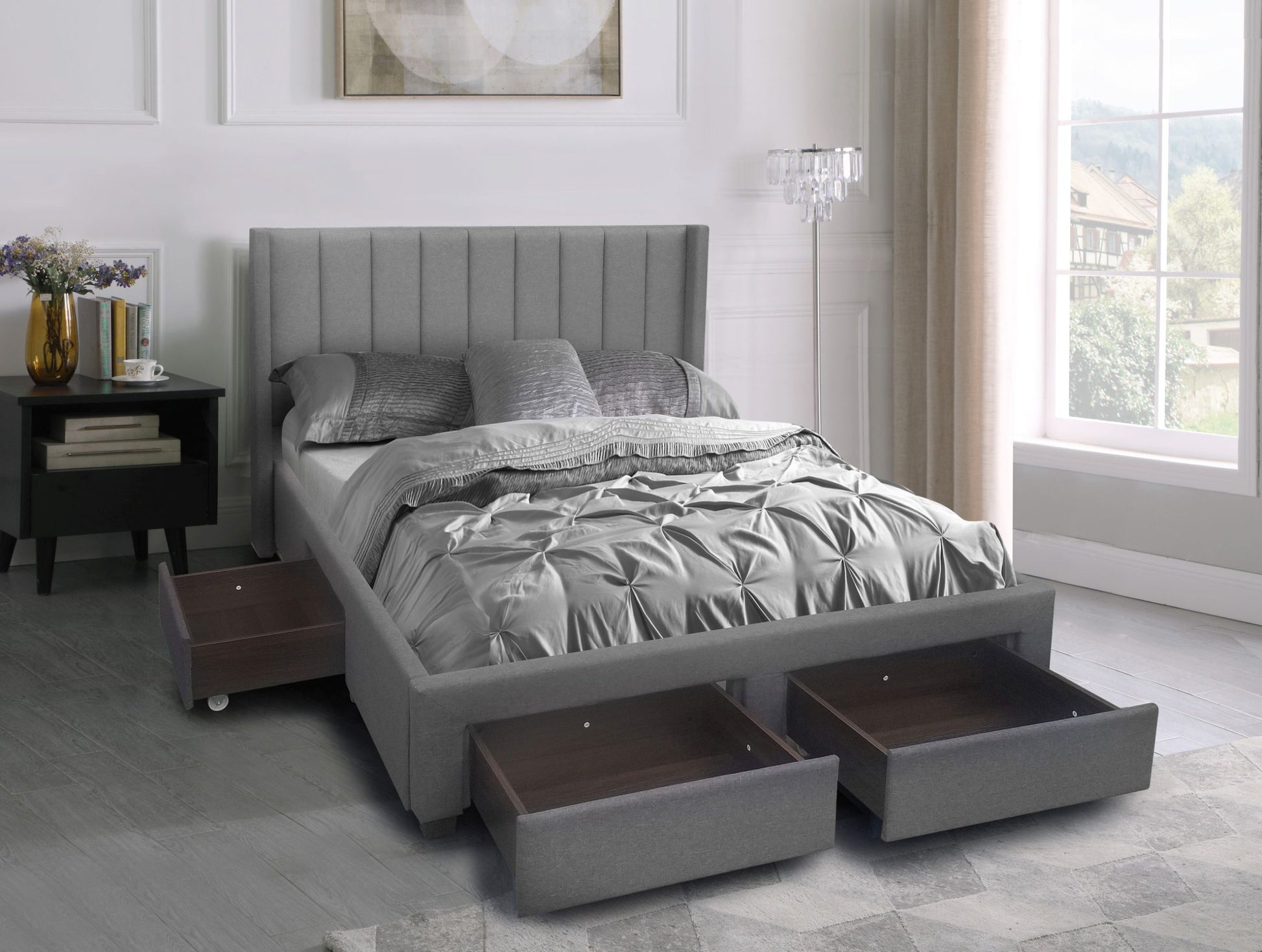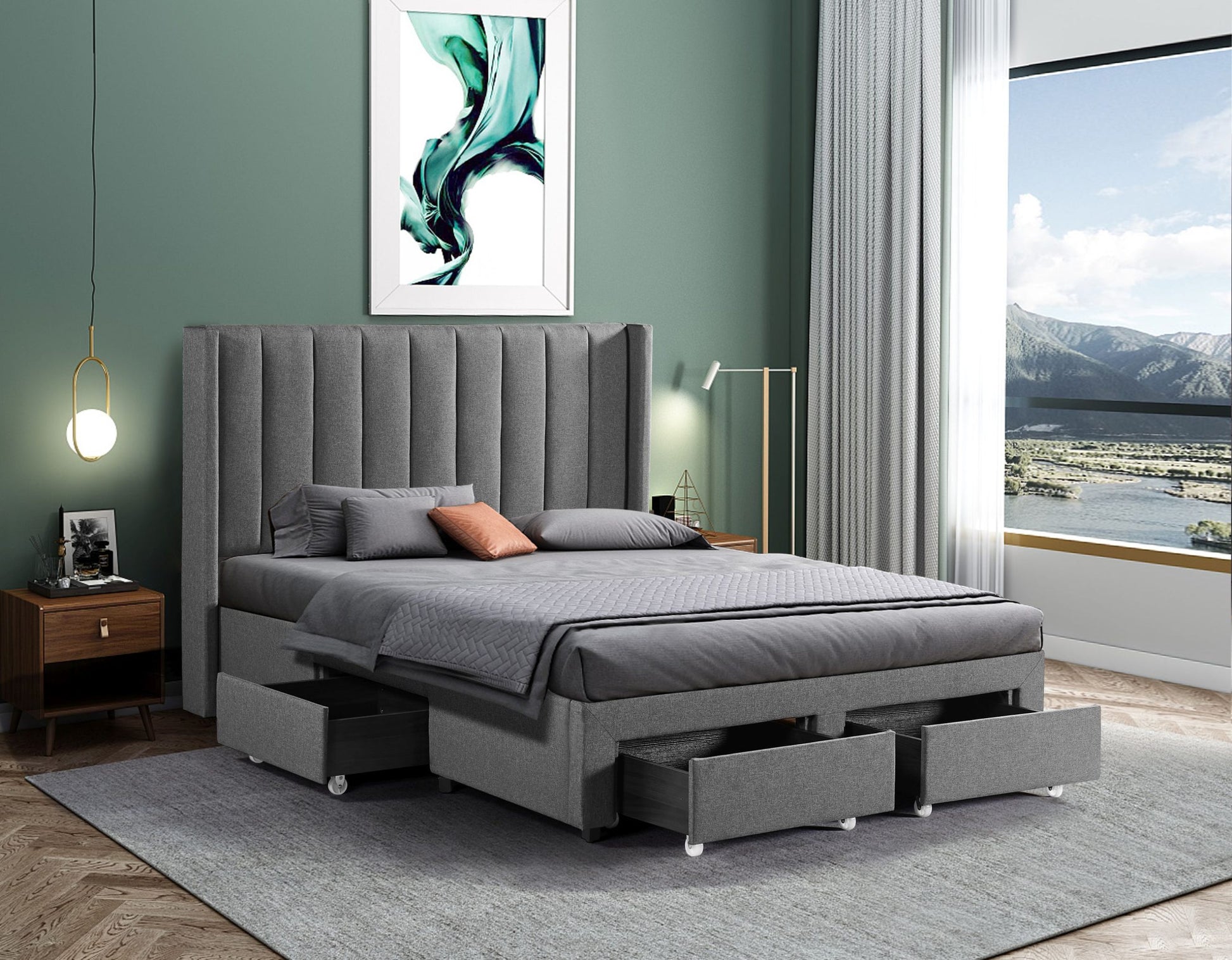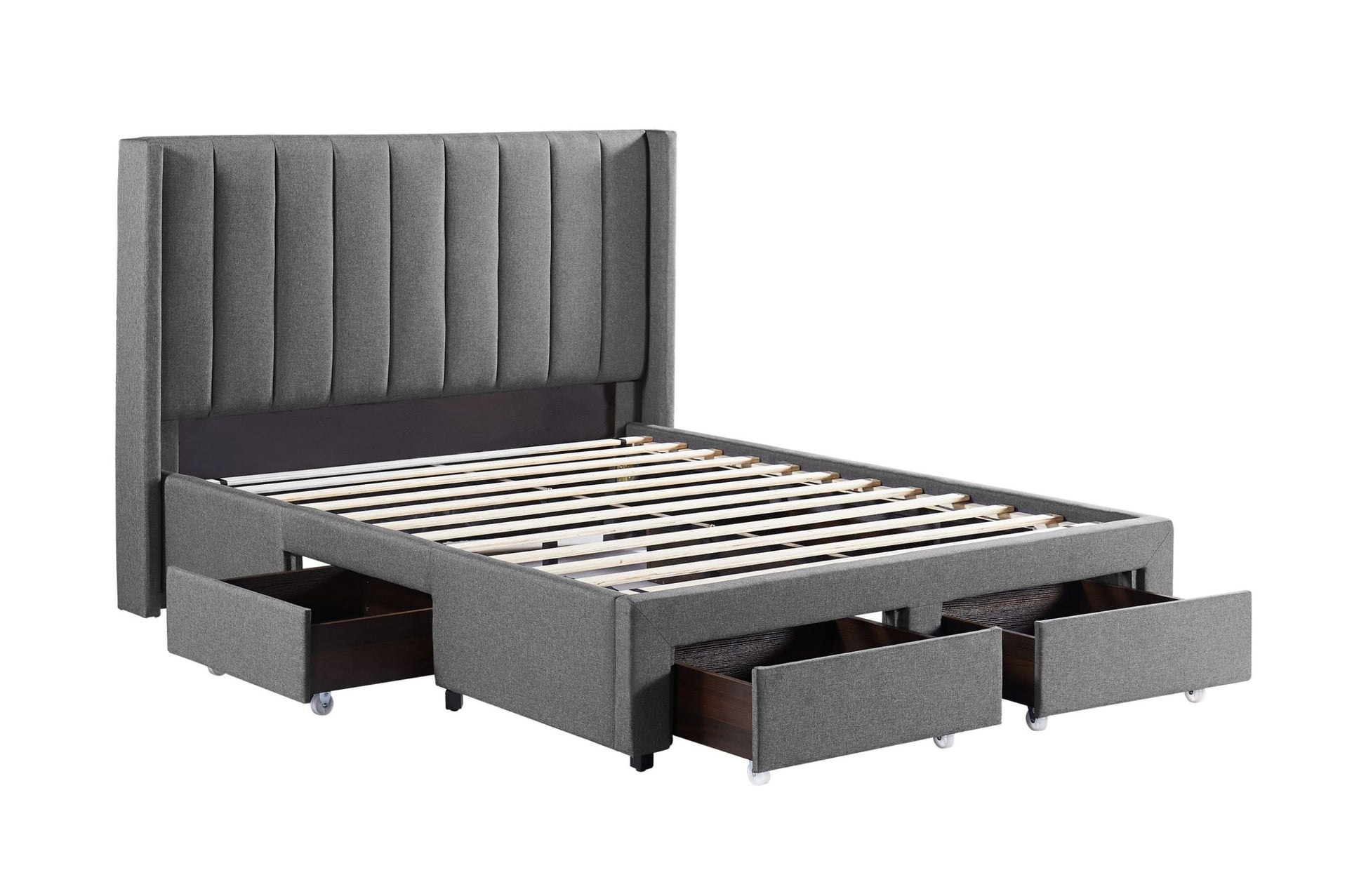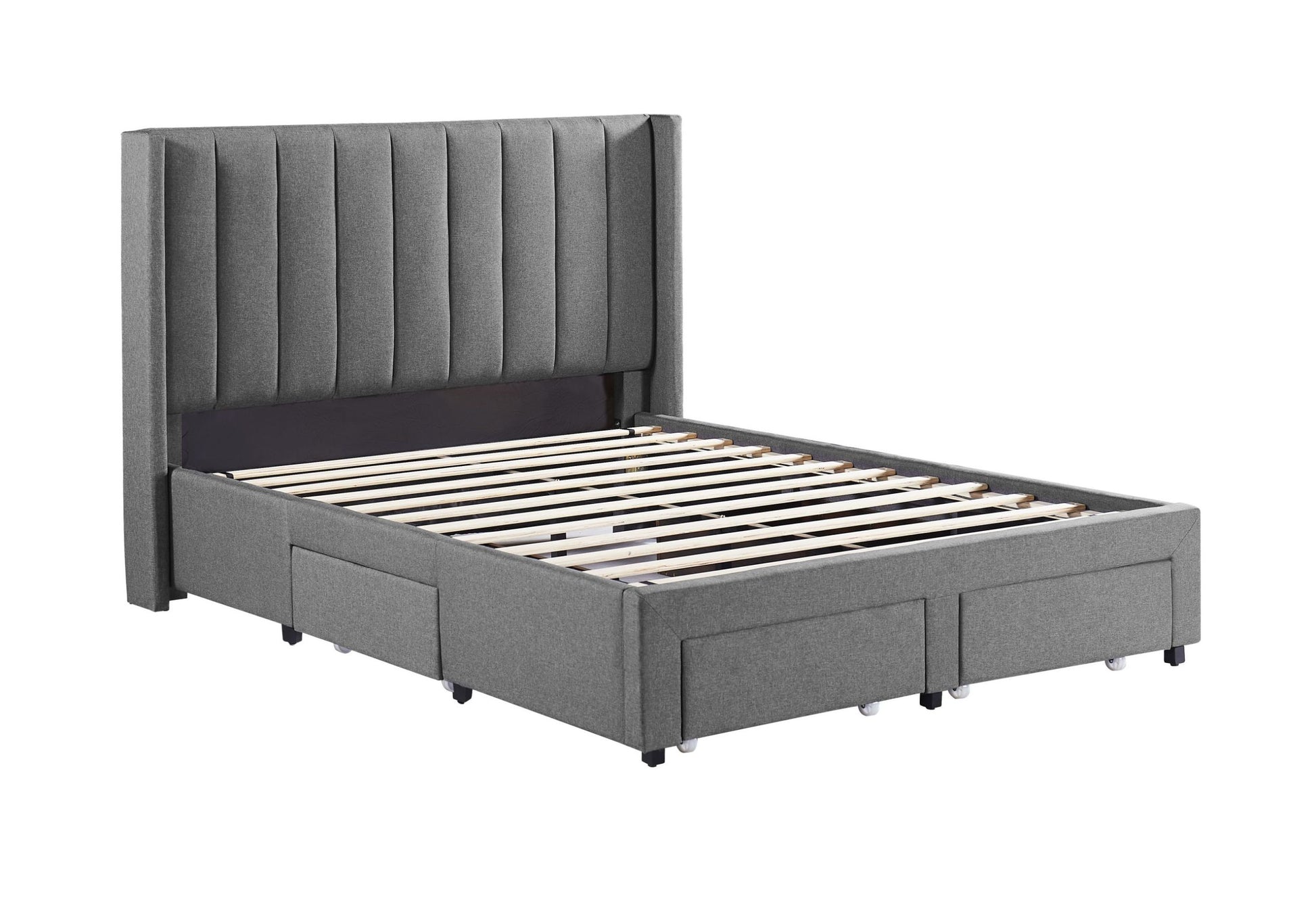 The Ashley Upholstered Platform Bed with 4 Storage Drawers in Grey is a king-sized bed that features a stylish and modern design. The bed is upholstered in a soft grey fabric, which gives it a sleek and sophisticated look that can match any bedroom decor.